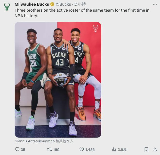 雄鹿今天甚至更新官方社媒账号,这样写道:“NBA历史上首次有三兄弟在同一支球队效力!”
