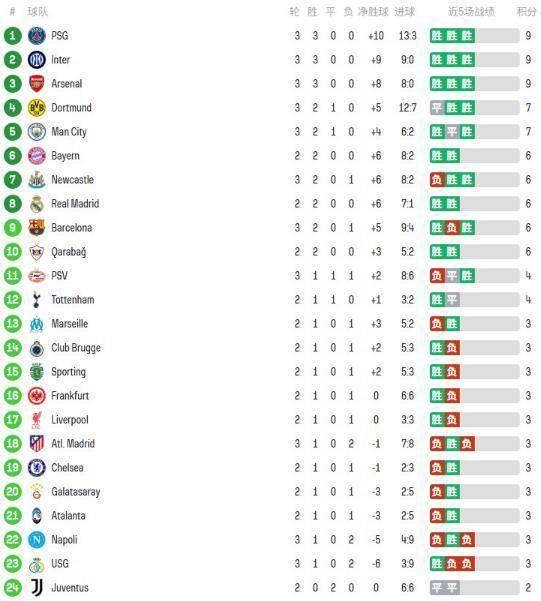 目前在欧冠积分榜上,国际米兰3战全胜打进9球0丢球的出色成绩,仅次于上赛季欧冠卫冕冠军大巴黎,位列积分榜的第二位。作为上赛季意甲冠军的那不勒斯3轮过后,仅取得1胜2负的成绩,目前暂列积分榜的第22位。其它两支意甲队伍,亚特兰大和尤文图斯在欧冠赛场上的表现,也同样不尽如人意。